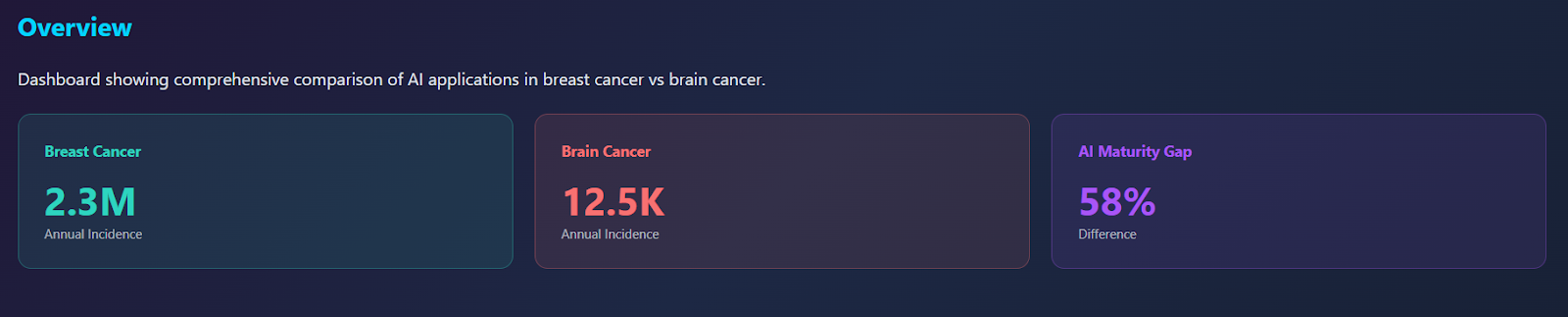 Brain cancer represents a smaller but far more biologically intricate group of malignancies, arising either as primary tumours, most commonly gliomas, meningiomas and medulloblastomas, or as secondary brain metastases from cancers elsewhere. Primary malignant brain tumours, particularly glioblastoma, originate from glial cells and are characterised by extreme genetic instability, rapid multiplication and highly invasive growth that takes over healthy brain tissue (Neuro-Oncology Insights, 2023). At the molecular level, brain tumours are shaped by mutations affecting cell differentiation, metabolism and DNA repair such as IDH1/2 mutations, MGMT promoter methylation, EGFR amplification and PTEN loss, which influence prognosis and treatment response (Gupta et al., 2024). For instance, IDH-mutant gliomas are slower-growing and more treatment-sensitive, while IDH-wild-type glioblastomas are typically more aggressive and resistant to therapy (Weller et al., 2021). Unlike breast cancer, brain tumours lack widely implemented population screening programmes, partly due to their lower incidence and the sensitive anatomical environment in which they arise (Louis et al., 2021). As a result, many cases present only once symptoms develop, often at a later stage. Data collection is therefore more limited, and biological diversity across tumour types, combined with a smaller dataset makes brain cancer a more challenging area for large scale research. The complexity and unmet clinical need provide strong motivation for advanced AI systems that can support diagnosis, characterisation and treatment planning.